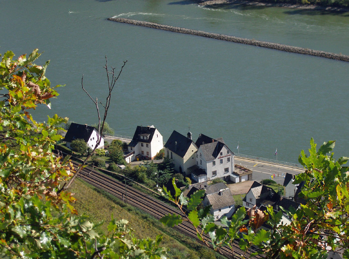 Weiter oberhalb konnten wir auf den Rhein und ein paar Häuser blicken. Förster Kapser erklärte uns, das man, um in die Kirche zu kommen durch eine Kneipe gehen muss. Es ist die Kapelle im Ehrental bei St. Goarshausen, hier befinden sich Kirche und Gastwirtschaft unter einem Dach.