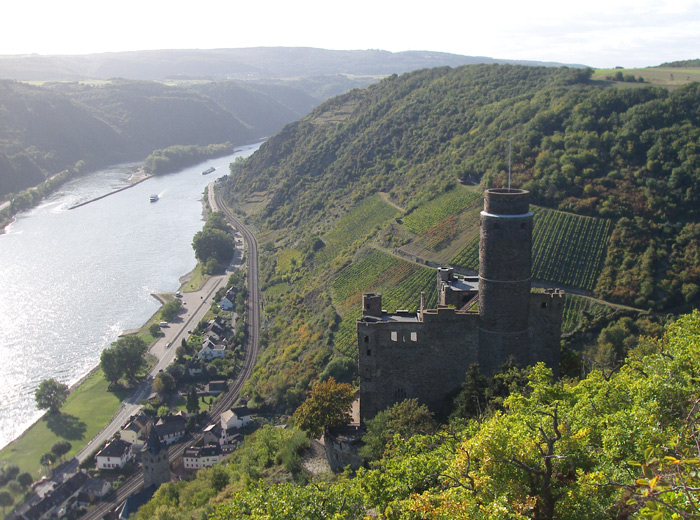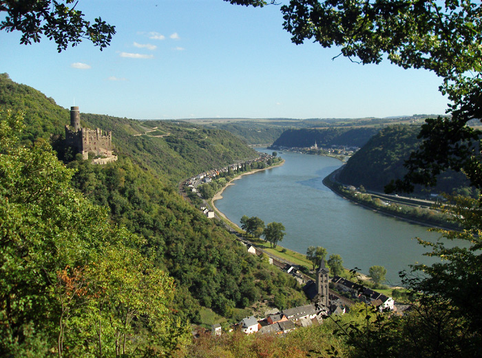 Nachdem wir an der Burg Maus (die man leider nicht besichtigen kann, bis vor einigen Jahren war dort ein Adler- und Falkenhof, z.Zt. wird ein neuer Pächter gesucht) vorbeigekommen sind ändert sich der Weg wieder in Pfade und geht in schmalen Serpentinen durch den Wald. Immer wieder bekommen wir Ausblicke auf den Rhein und können die Burg von oben bestaunen.