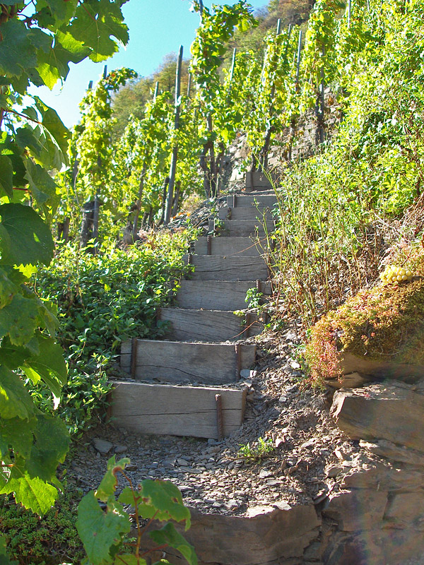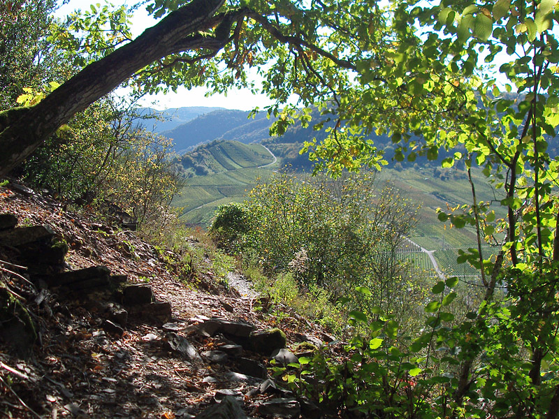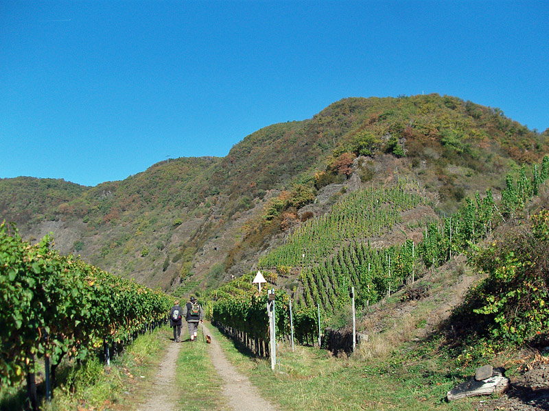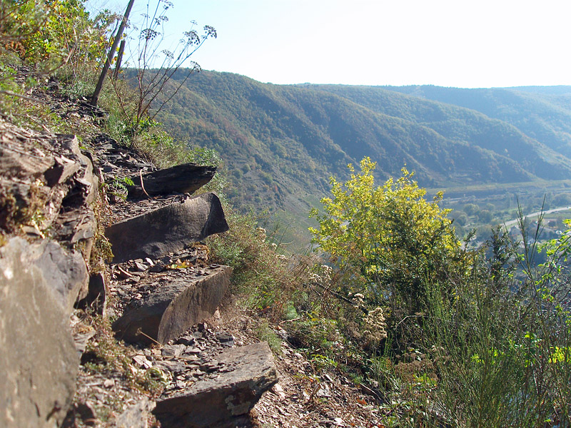 Nach dem Abzweig geht der Weg richtig steil hinauf und an diesem, eigentlich kühlen, Oktobertag kommt man hier in den Weinbergen – nicht nur durch die Anstrengung – sondern auch durch den aufgeheizten Schiefer ganz gut ins schwitzen. Trotz der 12 Grad bin ich im kurzen Polohemd unterwegs.