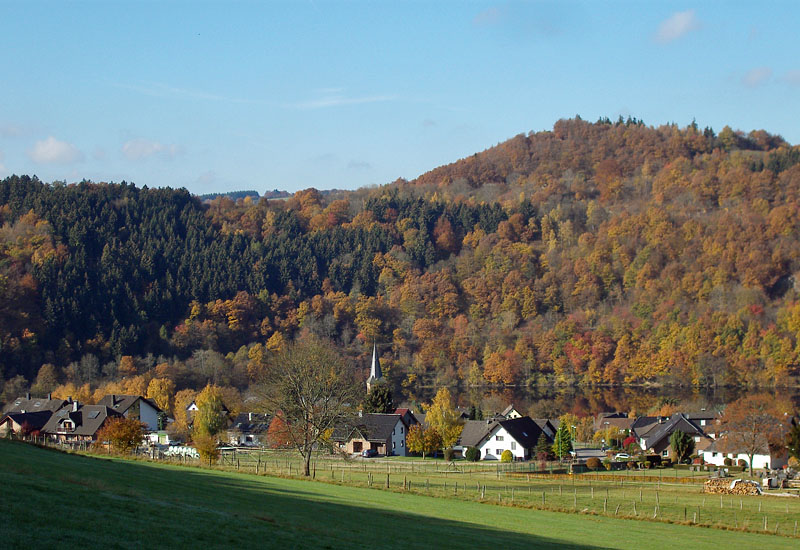Am Dienstag bin ich nach einem ausgiebigen Frühstück um kurz vor Zehn aufgebrochen. Die Strecke nach Gemünd kannte ich ja schon von gestern und dort hab ich in der Stadt geparkt. Hier ging es dann zunächst an der Kirche vorbei einen schmalen Pfad den Wald hoch. Noch hörte man die Verkehrsgeräusche aus dem Ort doch nach knapp 3 Kilometern erreicht man den Aussichtspunkt Kuckucksley. Von dort hat man einen guten Blick auf Olef. Hier gehts sehr steil hinunter und ich muss aufpassen nicht umzuknicken oder auszurutschen.