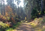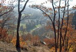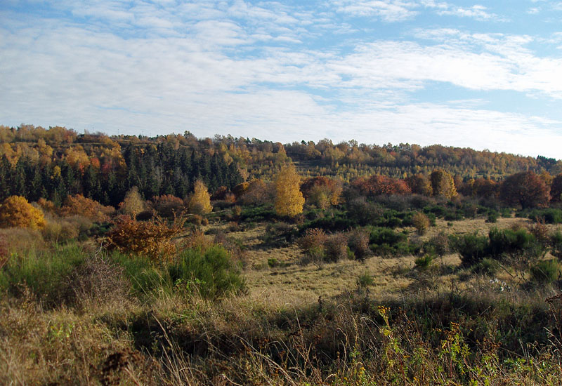 Nun ging es endlich los, mittlerweile war es schon 11:30 Uhr und für die Etappe waren 6 Stunden angesetzt. Seit 2 Tagen war Winterzeit, also hieß es „Gas geben“, da gegen 17:15 Uhr die Sonne untergeht… Aber noch genoß ich blauen Himmel und schönsten Sonnenschein. In Einruhr ging es zunächst kurz durch den Ort, dann folgte ein Anstieg über Wiesenwege, die später in den Wald führten.