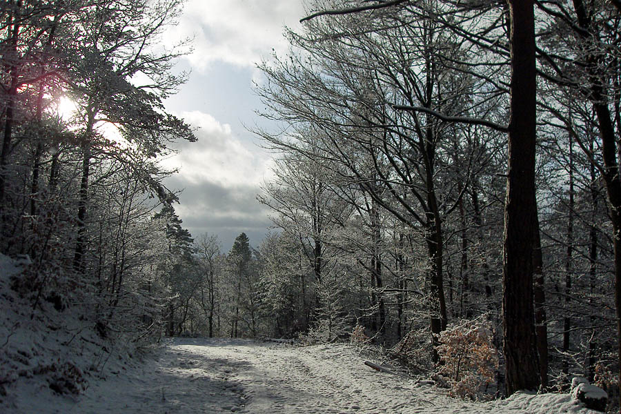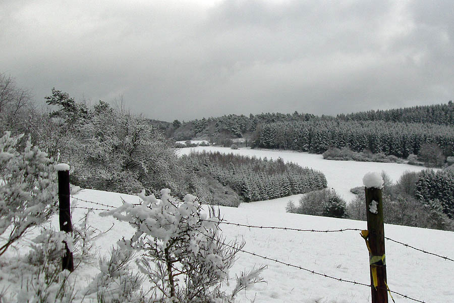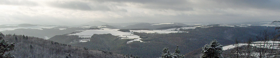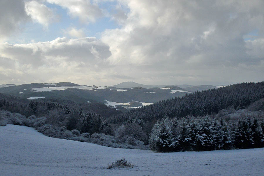 Oben angekommen wurde der Schnee auch auf den Bäumen dichter. Nun konnte ich den weiten Blick über das Land schweifen lassen. Die „Hohe Acht“ mit 747hm war deutlich zu erkennen und überall war das Land weiß angehaucht. Teilweise war blauer Himmel zu erkennen und später kam sogar ein wenig die Sonne hinaus.