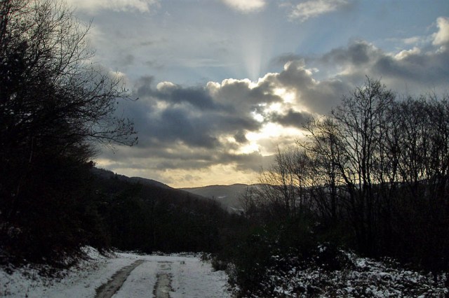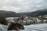 Nun ging es weiter und der Weg führte in Kehren wieder hinab nach Hönningen. Noch ein paar mal gab es schöne Weitblicke bis zur Hohen Acht, doch je weiter ich runterkam um so mehr merkte ich das es wärmer wurde und der Schnee langsam schwand. Es taute. Ein gutes Stück weiter sprangen 2 Rehe vor mir über den Weg und verschwanden im Wald.
