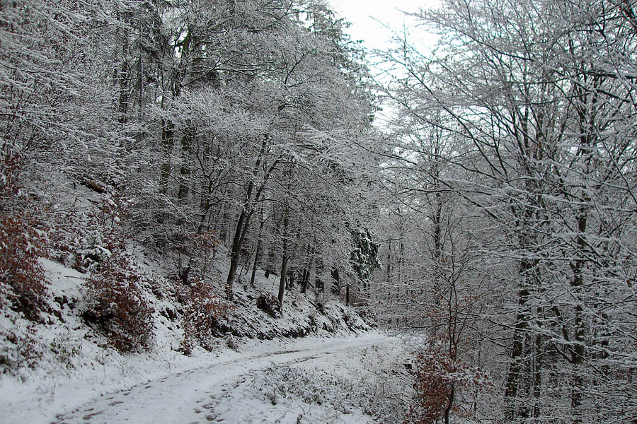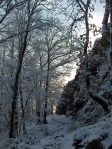In Hönningen bin ich an der Teufelsleystraße gestartet und hab meinen Smart dort geparkt. Ein kleines Schild weist auf die Teufelsley hin. Hier lag zwar Schnee, man merkte aber, das dieser doch recht nass war und langsam taute. So ging es erstmal den Berg hinauf. Leider ist die Strecke nicht wirklich gut ausgeschildert, daher sollte man sich den Track von mir runterladen oder ausdrucken. Ich bin die Strecke auch per GPS-Track mit dem iPhone gelaufen, denn selbst die Wanderkarte „Das Ahrtal“ gibt für diese Tour leider nicht wirlich viel her und Markierungen fehlen gänzlich. Und im Schnee – besonders wenn man mal wieder fast allein unterwegs ist und es so größtenteils keine Spuren im Schnee gibt – ist die Orientierung deutlich anders als sonst.