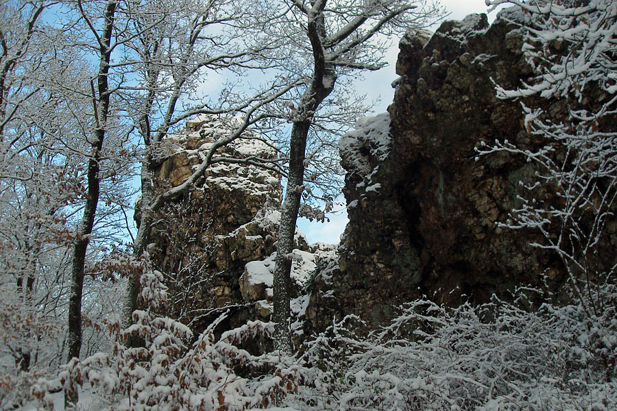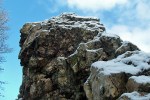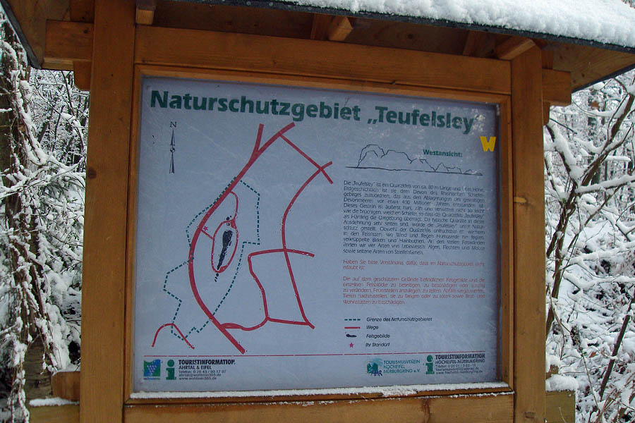 Die Teufelsley liegt in einem Naturschutzgebiet „An der Teufelsley“ und ist ein Quartzfels von ca 80m Länge und 14m Höhe. Er ist der größte zusammenhängende Quarzitblock Europas. Hier oben gab es bereits ein paar Spuren im Schnee denen ich einmal um diesen imposanten Felsen gefolgt bin und später wieder auf den Wanderweg zu gelangen.