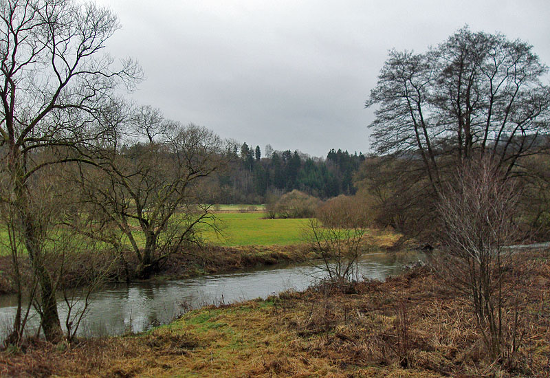 ___________________________________________________________ Später gehts rechts den Weg einem schmalen Pfad folgend wieder steil bergauf und nachdem ich den Westerwald Steig verlasse und dem Schild Richtung „Kloster Ehrenstein“ folge, verändert sich die Wegführung über einen nun breiteren, steinigen Forstweg sanft bergab bis ich die Ebene. Hier kommen Wiesen und die Wied wird abermals – über ein sehr wackelige Hängebrücke – passiert.