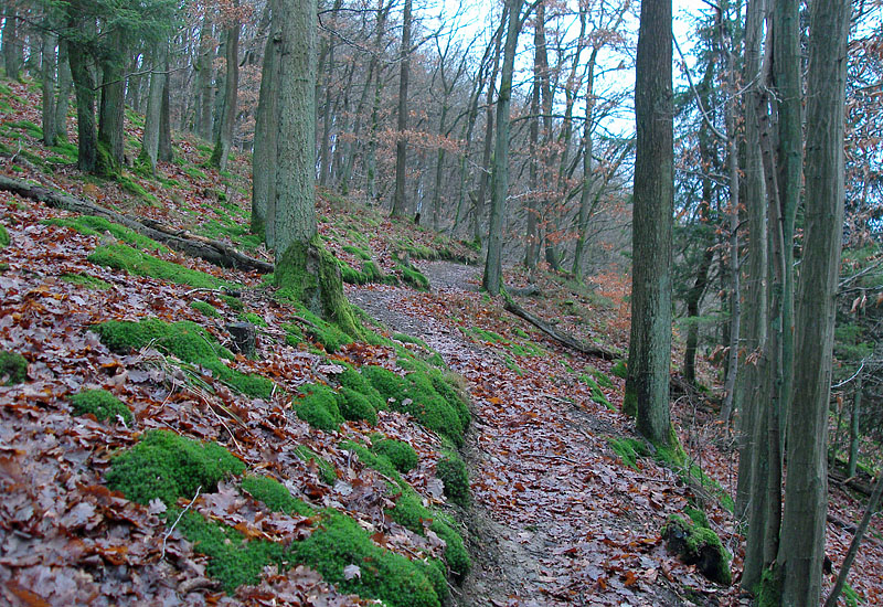 Nun geht es sogar durch einen 156m langen Tunnel, der mit einer automatischen Beleuchtung versehen ist. Durch die seitlichen Nischen, die trotz der Beleuchtung komplett im Dunkeln liegen, find ich es unheimlich hier drin und mach das ich flott durchkomme. Dann gehts links steil hoch – immer noch dem Westerwaldsteig folgend. Der Weg wird zum schmalen Singletrail und teilweise ist es aufgrund der feuchten Witterung der letzten Tage recht schmierig und ich muss aufpassen nicht auszurutschen.
