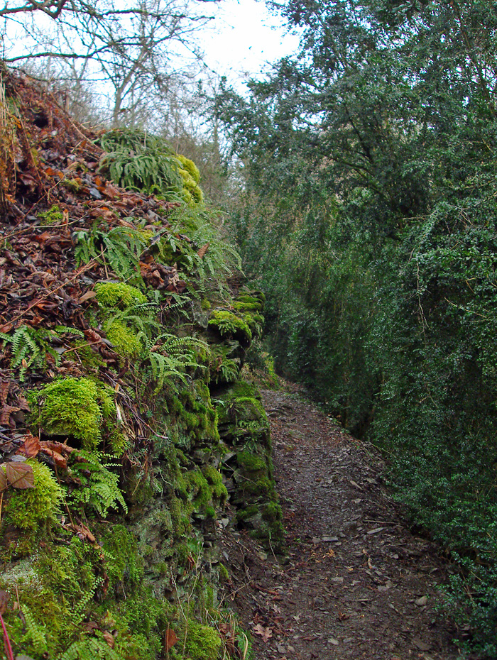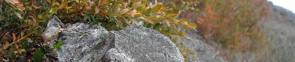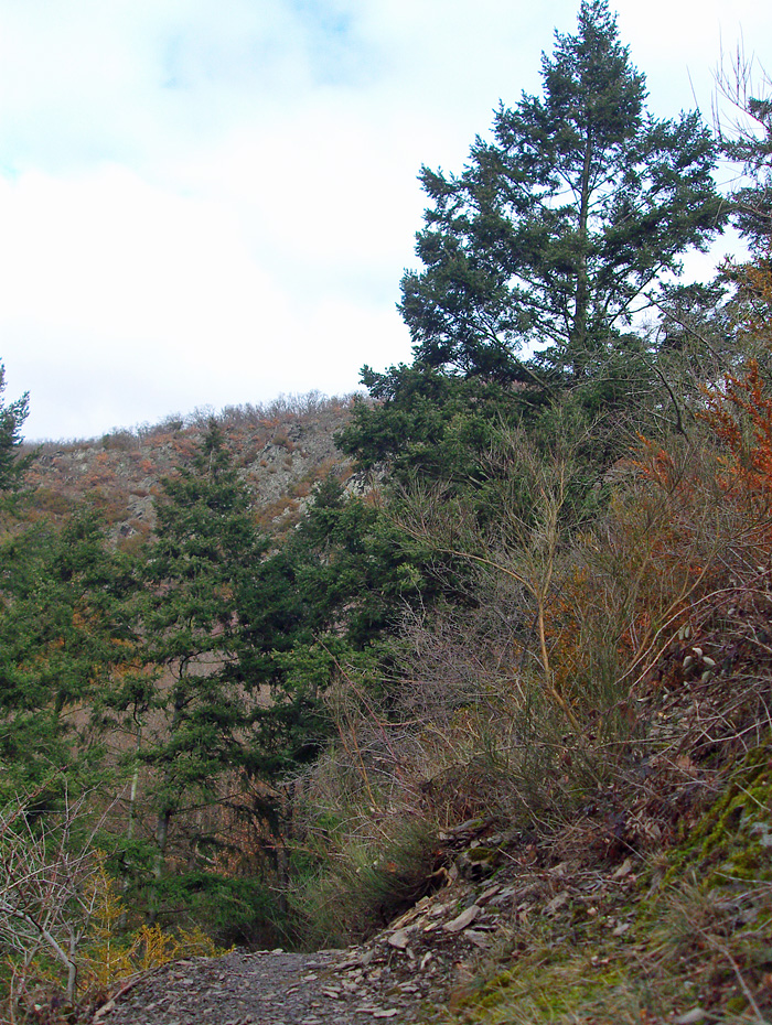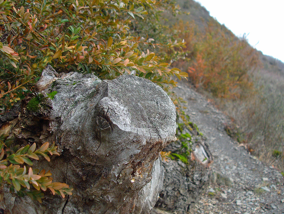 BuchsbaumEinen knappen Kilometer später begann dann auch der offizielle Teil des Buchsbaum-Wanderpfades. Der schmale – und zum Teil alpine – Pfad und die ersten Buchsbäume waren auszumachen. Jetzt ging es hinauf und hinab über Felspfade die mit Moosen und Flechten übersät waren. Der Buchs hier leuchtete in allen Farben: grün, gelb, braun, orange und fast rot war er. Ein Farbflash an diesem bewölkten Wintertag.