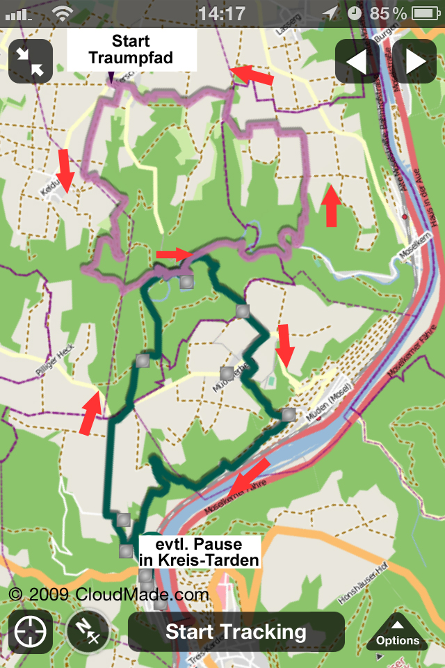 Dann würde ich allerdings oben am Traumpfad nach rechts gehend in Richtung Keldung über den Petersköpfchen starten (entgegen dem Uhrzeigersinn) um dann bei der Burg Eltz in diese Tour überzugehen (im Uhrzeigersinn) und später wieder an der Burg Eltz dem Traumpfad (entgegen Uhrzeiger) zu folgen. Sozusagen eine 8. Dies hätte den Vorteil, dass man nach ca 12km eine schöne Pause in Treis-Karden machen kann.