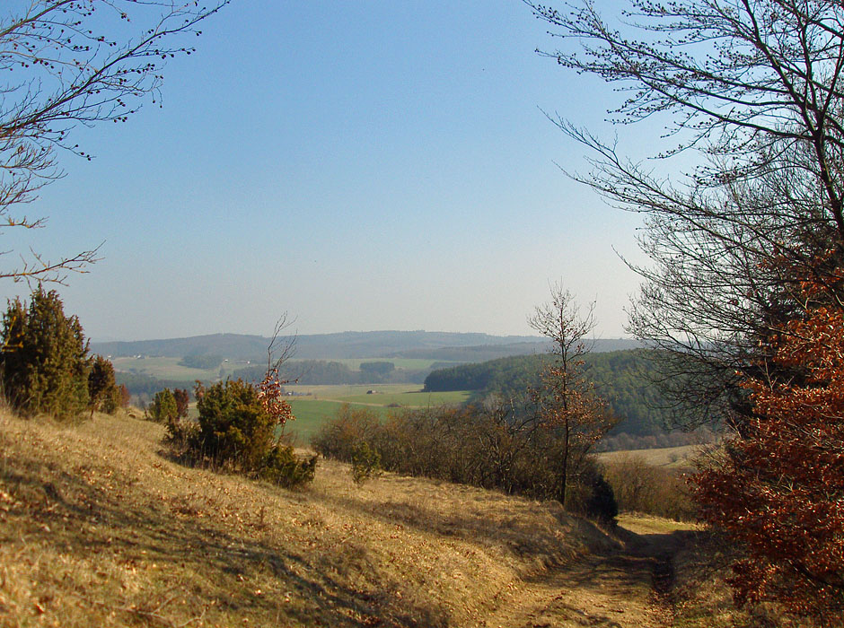 Unten komme ich an einen weiteren Geo-Pfad-Punkt, den Steinbruch Niederehe. Weiter geht es auf schmalen Pfaden, nun wieder auf dem Eifelsteig. Die Strecke verläuft nun oberhalb von Niederehe und das nächste Ziel ist der Wasserfall. Aber bis dahin geht es wieder über Wiesenwege und beim Blick zurück habe ich eine tolle Aussicht auf Niederehe und die Wacholderheide, über die ich auf dem Hinweg gegangen bin.