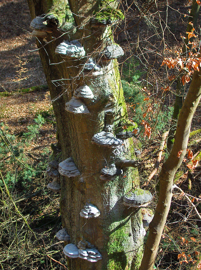 Das Gebilde an dem toten Baum ist übrigens ein Zunderschwamm. Interessant an dem Pilz ist, das er immer parallel zum Boden wächst. Wenn ein befallener Baum umstürzt dann dreht sich der Schwamm mit der Zeit so dass die gerade Seite wieder zum Boden zeigt.