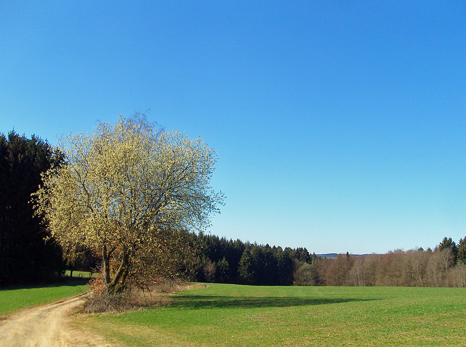 pfadiger, der Wald auch hier voller Ilex, dessen grüne Blätter in der Sonne glänzten, dann ging es durch Tannen-, dann wieder Mischwald und nach knapp 10km sogar aufs freie Feld. Der freie Blick übers Feld währte jedoch nur kurz und wieder ging es in den Wald. Auf schmalem Pfad in herrlichst wechselndem Grün. Viele junge Triebe waren überall zu sehen und man merkte – auch aufgrund der warmen Temperaturen – das hier alles im Aufbruch war.