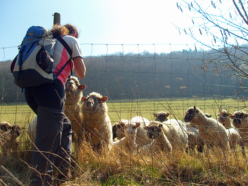 Karin umringt von SchafenDann ging es in den Wald und irgendwie waren wir beide so schön im Wander-Weiber-Rede-Flash, dass wir einen Abzweig verpasst hatten. Da ich das GPS ja immer parallel mitlaufen habe, wussten wir immerhin, das wir nur kurz durch den Wald abkürzen konnten. So kamen wir bei den Schafen vorbei und als Karin ein Foto machen wollte kamen all die großen und kleinen Wollknäuel an den Zaun. Weiter hinten war sogar eins, das vielleicht wenige Stunden alt war und noch auf wackeligen Beinen stand. Herzallerliebst.