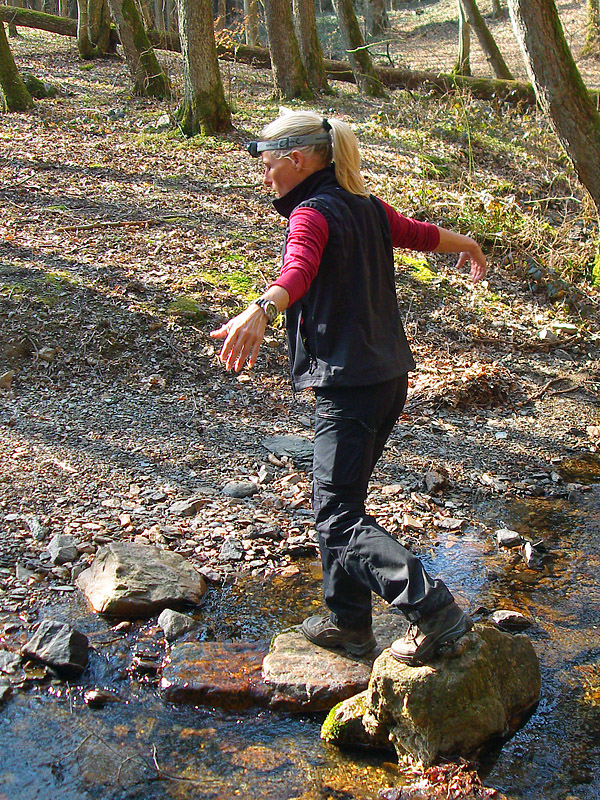 Mit Stirnlampe über die SteineVor der Schinderhanneshöhle wurde die Stirnlampe ausgepackt und wir querten über die Steine  den Bach um an die Höhle zu gelangen. So ging – vielmehr krabbelte – ich voran um einen Blick in die Höhle zu werfen. Allzu viel konnte ich nicht erkennen und ich fand es eher unheimlich. So machten wir uns weiter auf den Weg und entdeckten später einige Buschwindröschen, die sich in der Sonne aalten.