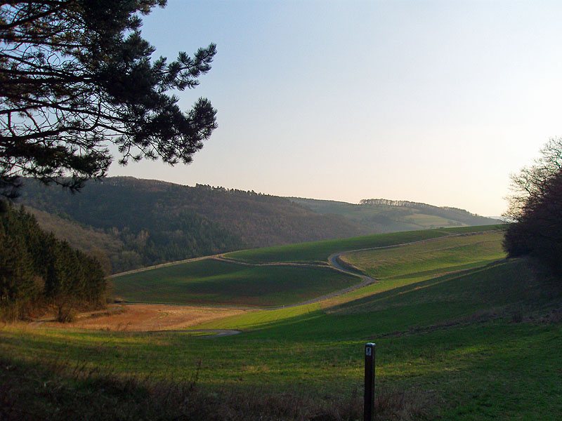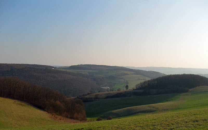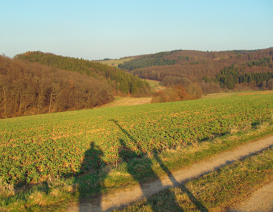 Wir machten noch eine kurze Rast um den letzten Proviant zu verputzen und dann kam der eigentliche Höhepunkt der Tour. In der Nachmittagssonne wurden wir die letzten beiden Kilometer auf Wiesenwegen über die Höhen geführt und hatten von hier eine wunderbare Aussicht auf die Höhenzüge des Soonwalds. Auch wenn das Laub an den Bäumen fehlte, konnte ich mir bildlich vorstellen wie herrlich das hier z.B. im Herbst aussehen musste.