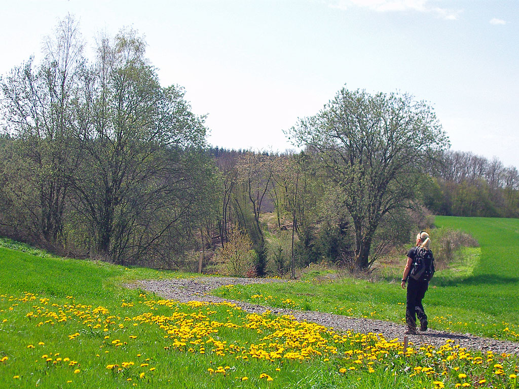 Dann wieder herrliche Wiesenlandschaft mit vereinzelten blühenden Obstbäumen. Es ging es wieder hinab in das Tal bis ich nach gut 9km den Fahlbach erreichte. Dieser geleitete mich plätschernd die nächsten Kilometer durch das Tal. Herrliche Ruhe, außer dem Vogelgezwitscher und dem munter sprudelnden Bach war nichts zu hören.