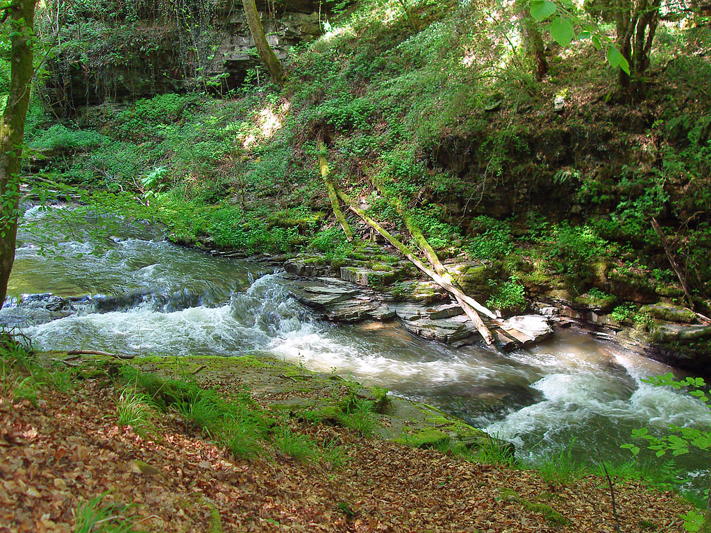 Vor allem weil der Üßbach sehr breit ist und recht spektakulär und kraftstrotzend daher kommt. Das Wasser ist beeindruckend klar und an vielen Stellen kann ich die einzelnen Stufen erkenne, die der Fluss in den Fels gespült hat.