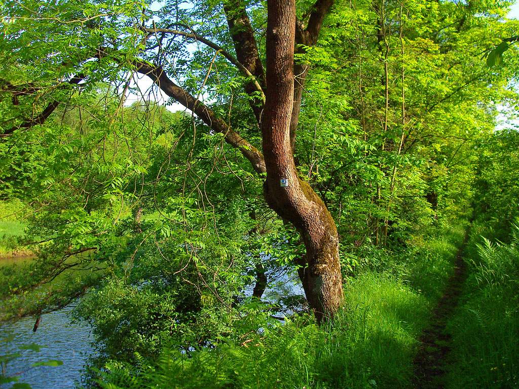 einem schmalen Pfad an der Sieg entlang. Ein lauschiger Pfad, der geschickt zwischen Gleise und dem Fluss entlangführt. Hier entdecke ich eine Libelle und mache in Ruhe ein paar Fotos von ihr. Der Weg führt weiter unter einer Unterführung entlang und durch die Bäume erkenne ich in der Ferne einen Mann mit einem großen Jagdhund, einem Deutsch Drahthaar. Dabei fällt mir auf, das an einem Baum eins der Klebeschilder fehlt. Hmm… Nun gut. Ich gehe also weiter und als ich den Mann einhole, ist er grade in Höhe eines weiteren Markierungsschildes und fängt an, daran herumzufummeln um es abzumachen.