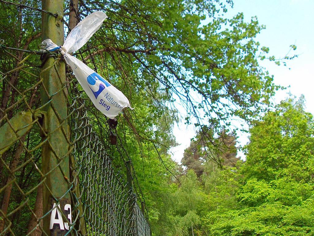 Dann geht es weiter durch den Wald bergan und an der höchstgelegenen Stelle der Tour, habe ich auch die auf der Webseite angekündigte Umleitung erreicht. Ohne den Hinweis auf der Seite, hätte man dies jedoch nicht erkannt. Kein Schild weist darauf hin, obwohl die Umleitung – wie online angekündigt – mit kurzen geknoteten Sperrbändern, die den Aufdruck Natursteig Sieg tragen, vorbildlich in Schnitzeljagd-Manier gekennzeichnet ist.