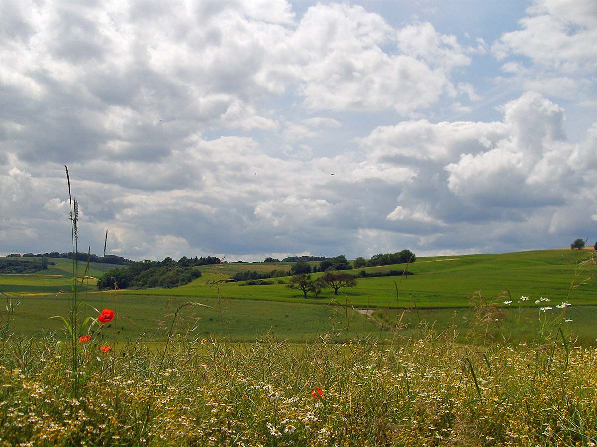 Aber schon bald geht es wieder hinaus und nun folgt für mich fast der schönste Teil der Tour. beeindruckende WolkenDenn durch die Wolken die für eine ganz besondere Lichtstimmung sorgen, wirken die Felder und Wiesen des nun folgenden Teilstücks ganz besonders und beeindrucken mich so, das ich mich ständig drehe und wende, ein Bild nach dem anderen mache und gar nicht genug bekommen kann.
