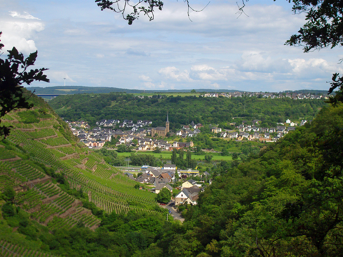 von einem Pfad blickt man auf Dieblich und kann sogar (links oben) den Fernmeldeturm in Koblenz erkennen