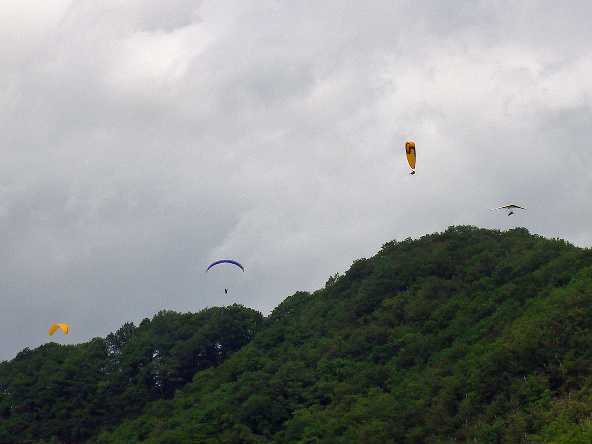 Ich quere die Gleise und werde nun über SchotterGleitschirmflieger und Graswege entlang der weitläufigen Weiden des Union-Gestüts geführt. Den Blick auf den Stachelberg, einem Startpunkt für Gleitschirmflieger. Ich erkenne einige Gleitschirmflieger und einen Hängegleiter, die das offensichtlich gute Wetter nutzen um sich vom Wind treiben zu lassen.