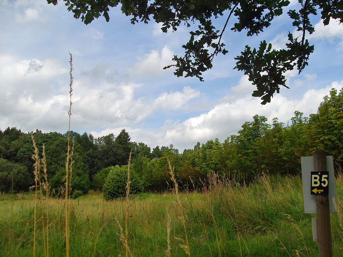 zweige dann aber nach rechts über den E4 ab. Auf dem lauschigen Pfad sehe ich die ersten wilden Himbeeren wachsen. An der Kreisstraße angekommen biege ich nach links ab und folge der Beschilderung B5.