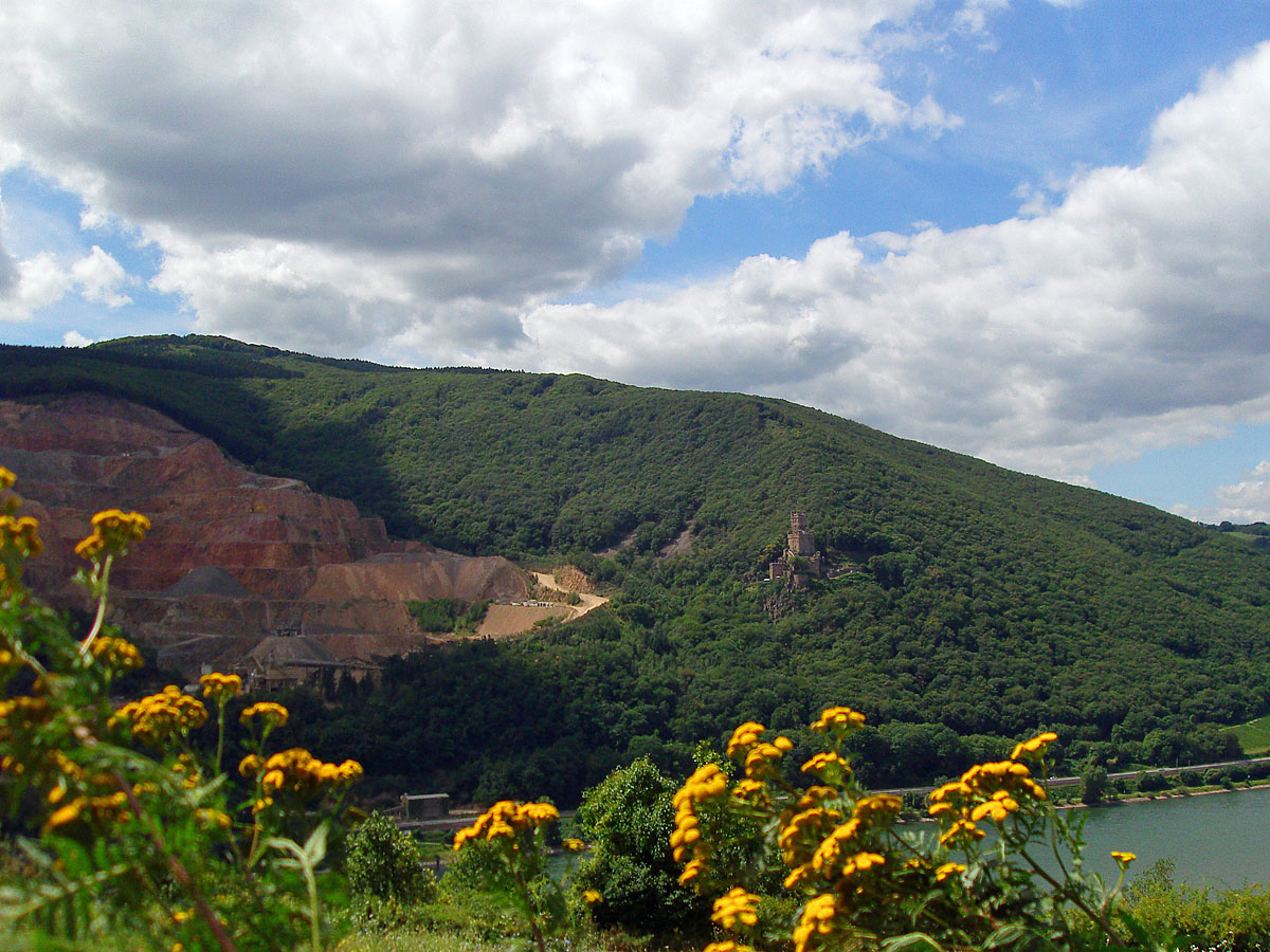 Steinbruch und Burg SooneckVorbei an alten Trockenmauern wo zurzeit eine bunte Blumenvielfalt zu finden ist geht der Blick auch auf die andere Rheinseite wo ein riesiger Steinbruch direkt neben der Burg Sooneck liegt.