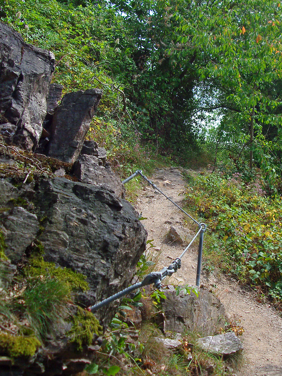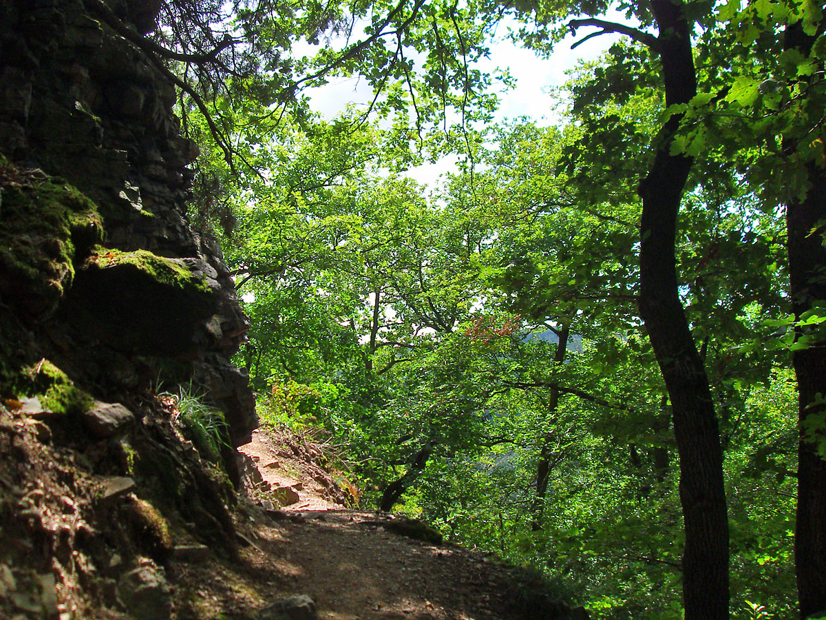 Nun heißt es den Teufelskadrich zu erklimmen (ok, ganz nach oben führt der Rheinsteig nicht) aber immerhin wird nun mit 350hm fast der Höchste Punkt der Tour erreicht. Hinauf führt ein schattiger Pfad vorbei an Kiefern, Felsen und Birken und immer wieder wird der anstrengende Teil mit schönen Ausblicken versüßt.