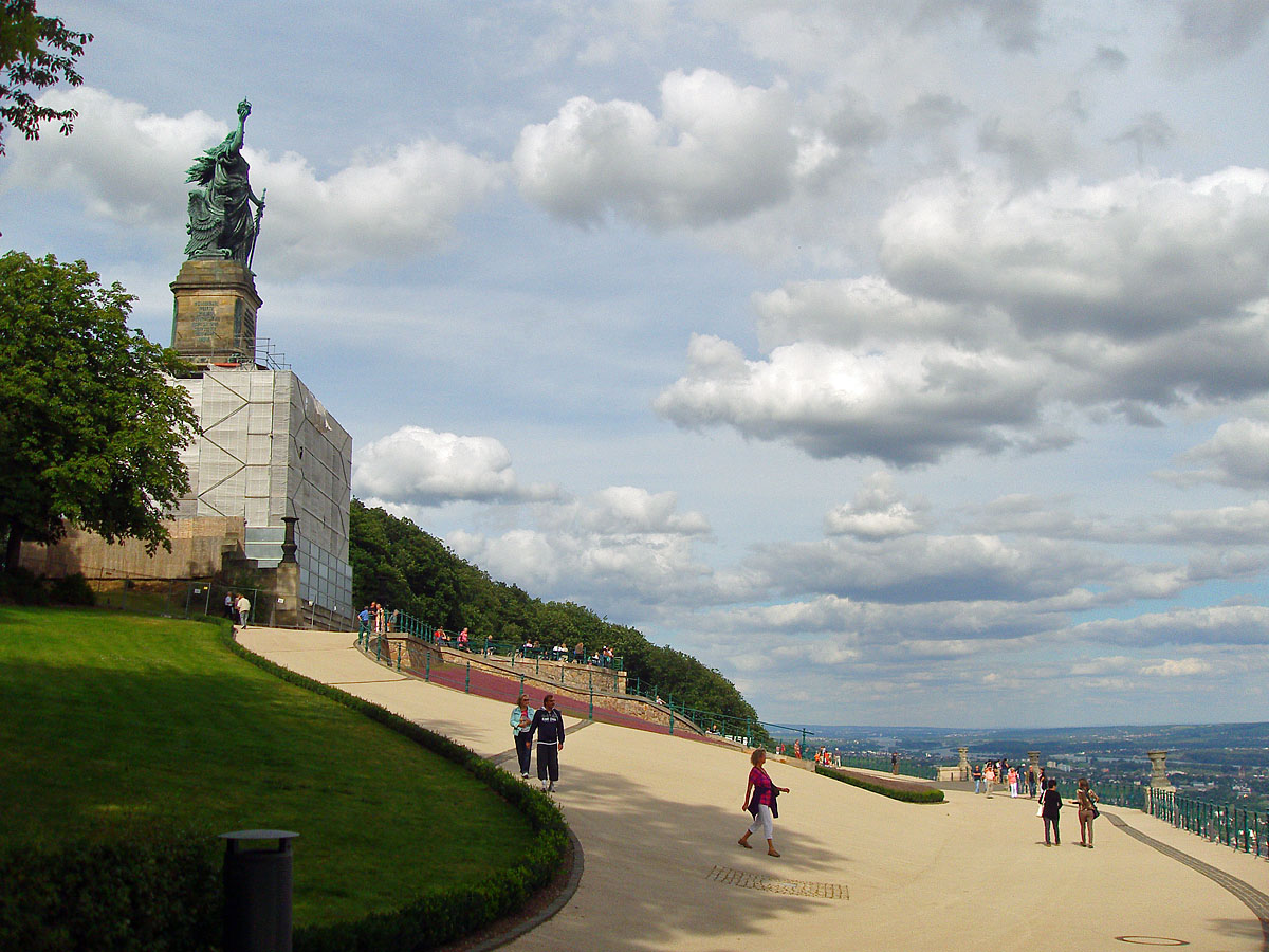 Nun geht’s durch die Weinberge und wieder ein Stück durch den Wald mit Blick auf Bingen und die Nahe, bis ich das eigentliche Ziel erreiche: das Niederwalddenkmal oberhalb von Rüdesheim. Ein Teil davon ist noch eingerüstet aber die Germania thront weithin sichtbar auf ihrem Sockel.