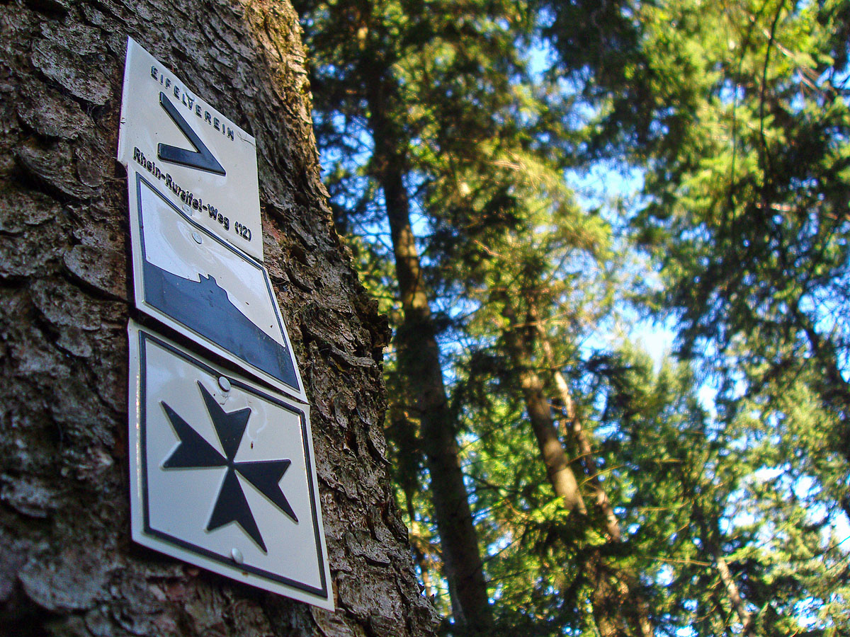 Der Asphaltanteil ist sicher höher als auf einem Prädikatsweg, dazwischen viel Forstwege aber auch schöne Wiesenwege und schmalste Pfade, wenn auch wenig. Der erste Teil führt viel durch den Wald (morgens noch schattig und recht kühl), später kommen viele Weitsichten und vor Herschbroich noch Wiesenlandschaften dazu.Beschilderung vom Eifelverein