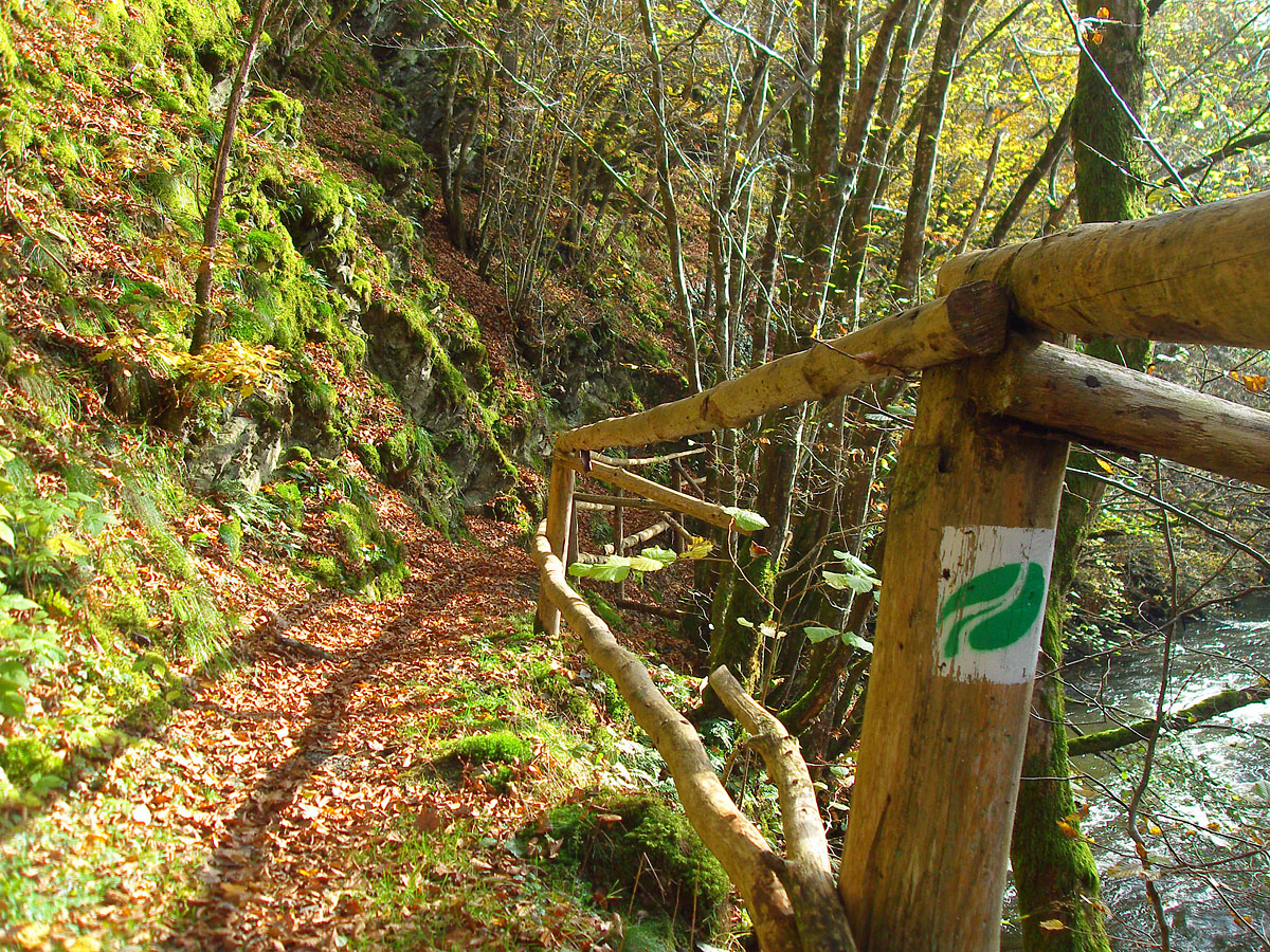 Dieses Zeichen ist unser stetiger BegleiterEin Abschnitt erinnert durch das Holzgeländer und die bemoosten Felsen an den Lieserpfad. Auf und ab werden wir an der Our entlanggeführt. Diese glitzert in der Sonne und um uns herum buntes Herbstlaub. Ich erzähle Marion, das mich das Logo des NaturWanderParks immer an eine Kaffeebohne erinnert und fortan heißt es nur noch: „Guck mal die Kaffeebohne“ :mrgreen: