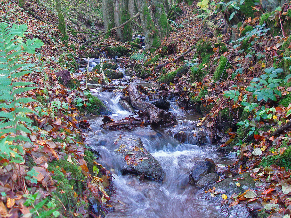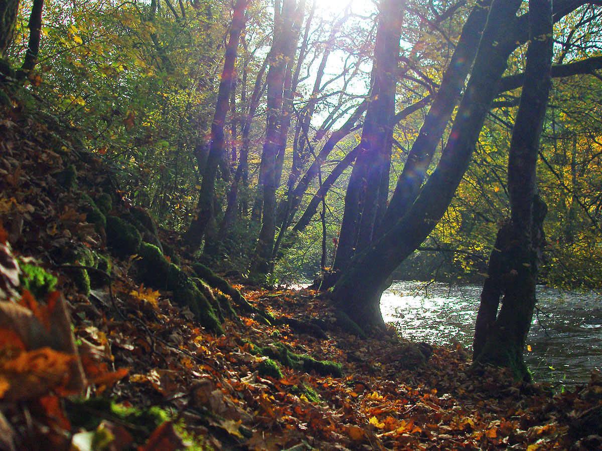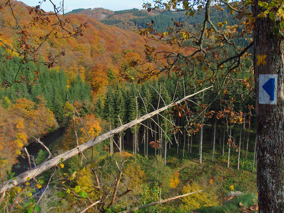Von dort führt der Weg dann wieder auf luxemburgischer Seite zurück zur Tintesmühle. Es geht über weiche Pfade durch Tannenwälder, dann wieder durch herrlichsten Laubwald und vorbei an einem gurgelnden Bach. Oberhalb der Rellesmühle haben wir einen schönen Blick auf die Our und im weiteren Wegeverlauf gibt es einen ausgeschilderten Aussichtspunkt (den Namen habe ich leider vergessen), der nur 100m entfernt ist.