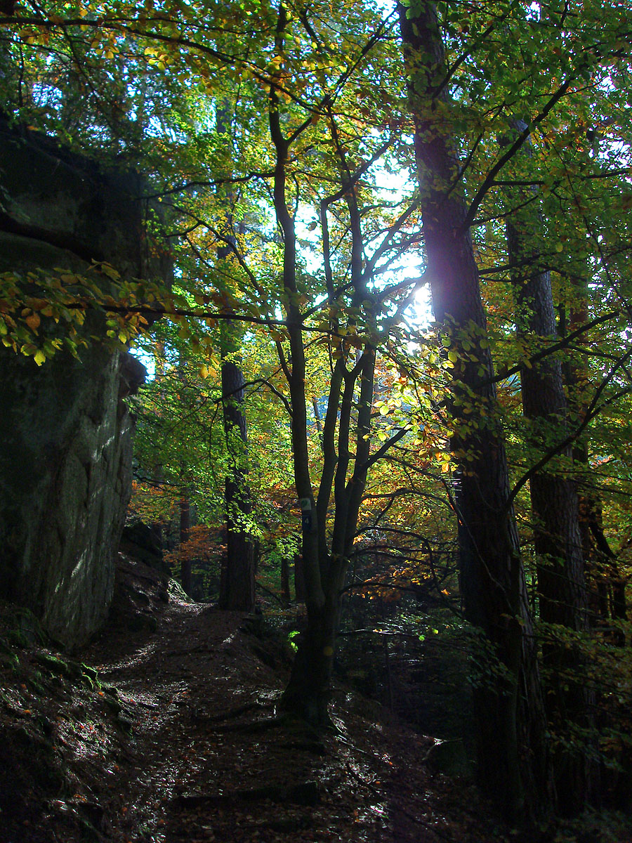 Bunte Pfade an den FelsenDa ich zwei Teilpassagen dieses Rundweges von meinen Touren aus August kannte und wusste, dass diese über viele Pfade führen, glaubte ich nicht daran, dass wir das in dieser Zeit schaffen würden, zumal Marion noch die Tour von Gestern in den Knochen steckte. So wollten wir es langsam angehen lassen und auf der Wanderkarte habe ich vorab schon ein paar Stellen zum abkürzen herausgesucht.