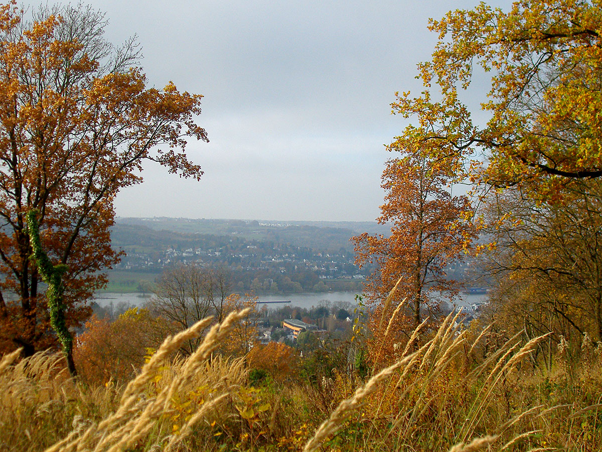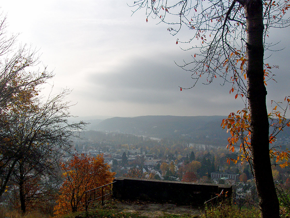 Bei klarem Wetter kann man hier eine wunderbare Aussicht bis weit in die Eifel genießen. Heute konnte ich trotz der Bewölkung immerhin das Haus, in dem ich wohne, auf der anderen Rheinseite erkennen.