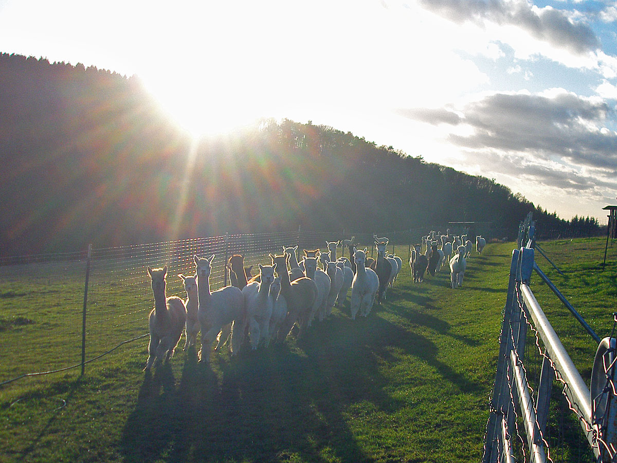 Als ich den Hof mit den Alpakas passiere, ist eine Frau grade dabei die Tiere von Ihren Weiden in den Stall zu lassen. Ich stelle mich an den Zaun um ein Foto zu machen. Doch die Tiere sind irritiert, stoppen und wollen nicht weiter. Also bin ich flugs den Hang hoch um den täglichen Ablauf hier nicht weiter zu stören.