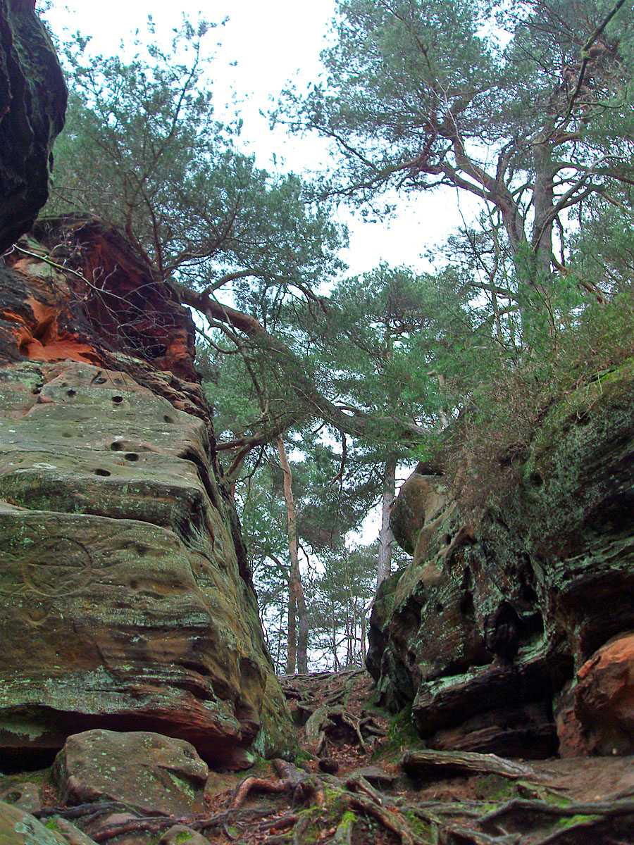 Ein Pfad führt auf weichem Weg hinab und dann wieder hinauf, bis ich die ersten Buntsandsteine erblicke. Schon oft bin ich hier gewesen, meist im Sommer, wenn die roten Felsen ganz warm sind und die Zapfen der Kiefern in der Wärme laut knacksen.