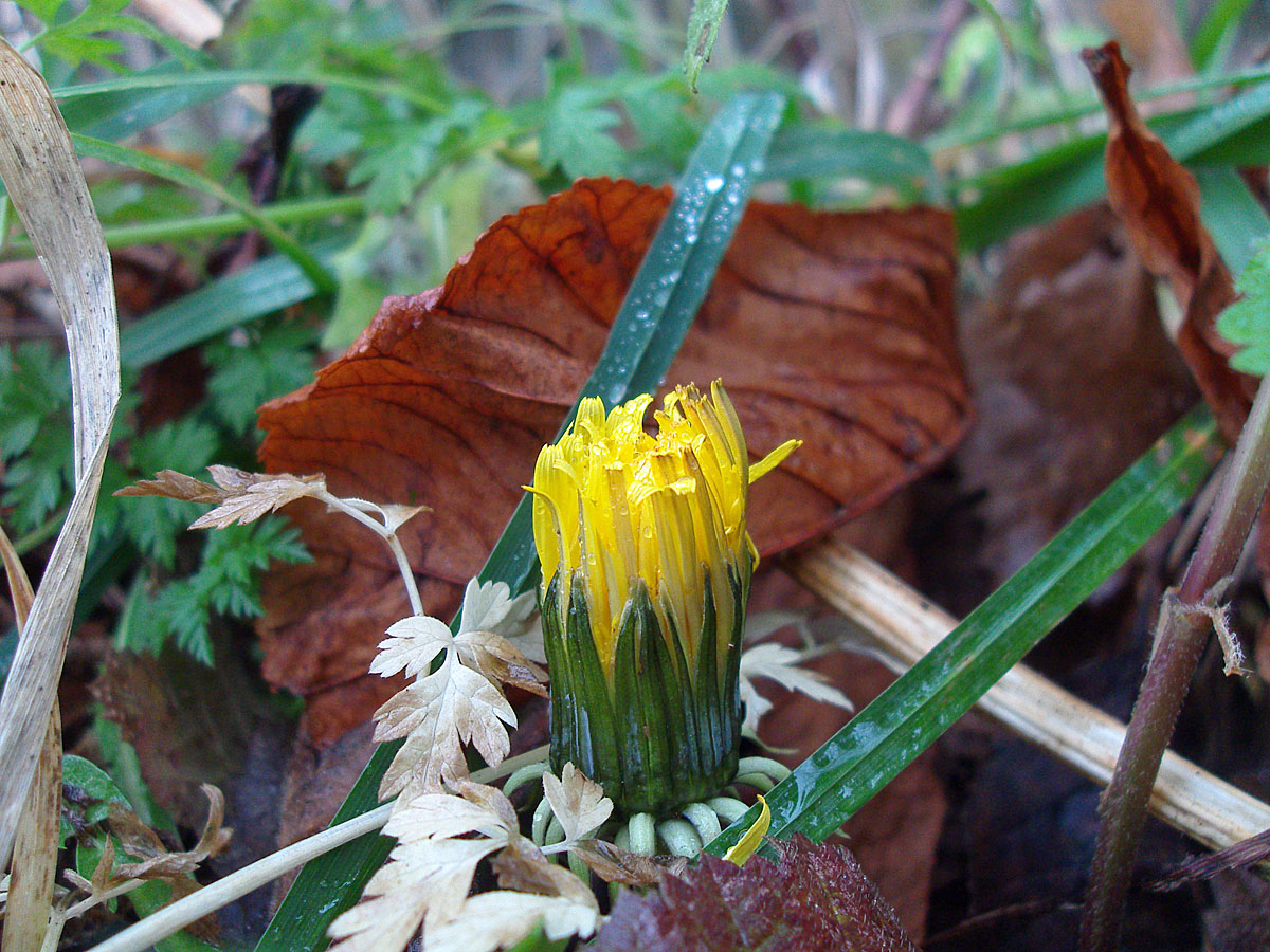 gelbe BlüteIch entdecke eine gelbe Blüte. Löwenzahn? Kann doch gar nicht sein, oder? Dem Matsch auf dem Weg weiche ich aus, beobachte einen Tracktor beim Gülle-Fahren und bestaune die schöne Linienführung der Wiesen auf der linken Seite.