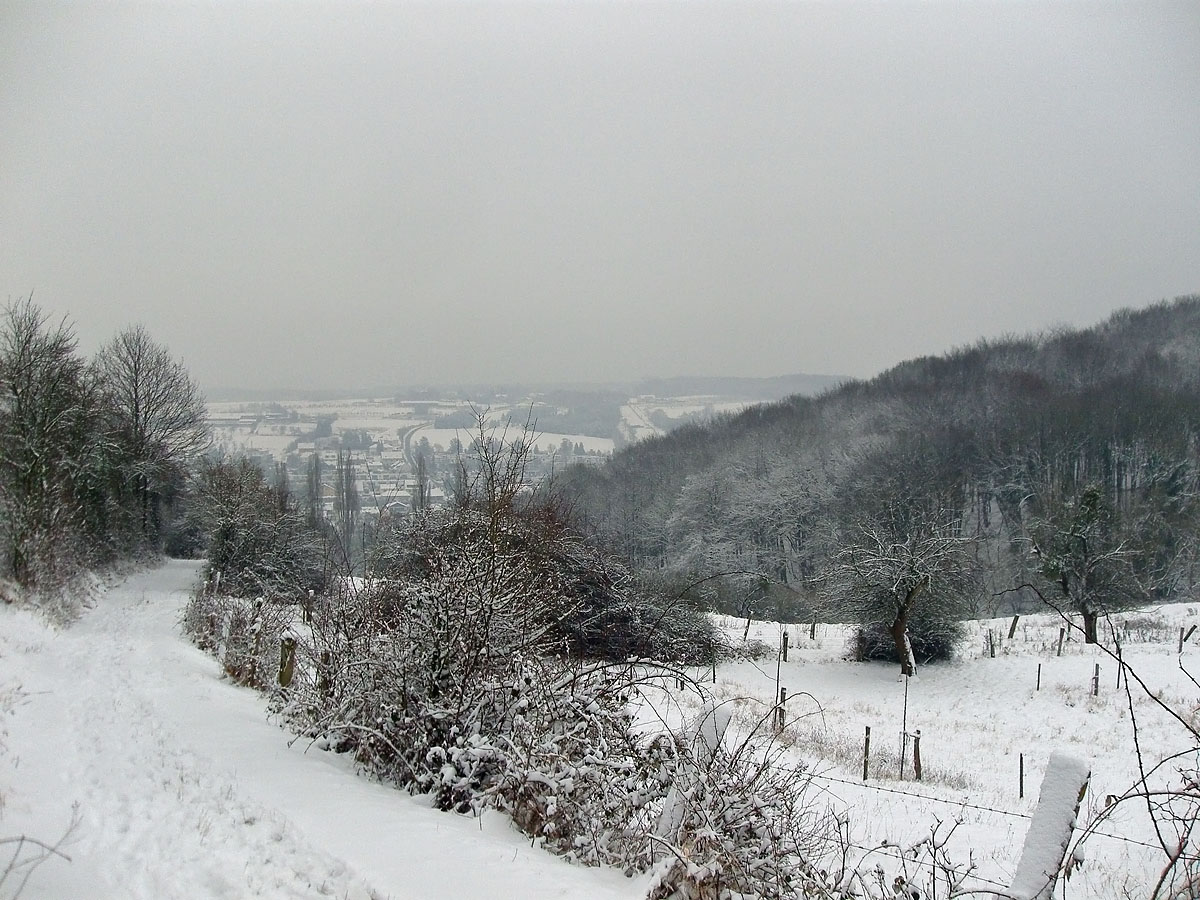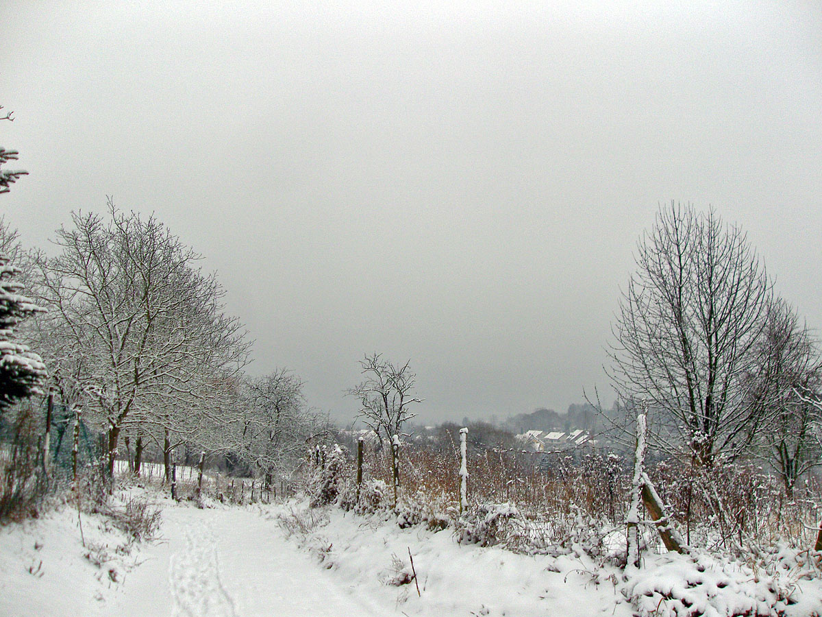 Kurz darauf erreiche ich den Rheinhöhenweg und folge ihm über eine kleine Brücke und dem Wittgesbach Richtung Ließem. Hier werde ich über einen Feldweg um den Ort vorbeigeleitet. Der Schnee ist nicht wirklich hoch, ich schätze grade mal so 10cm. Immerhin hat die Menge heute Morgen gereicht, um ein Verkehrschaos in der Region auszulösen. Es geht hinauf und ich folge einem Feldweg bis zu einer Kapelle. Daneben führt ein schöner Weg hinab nach Niederbachem.