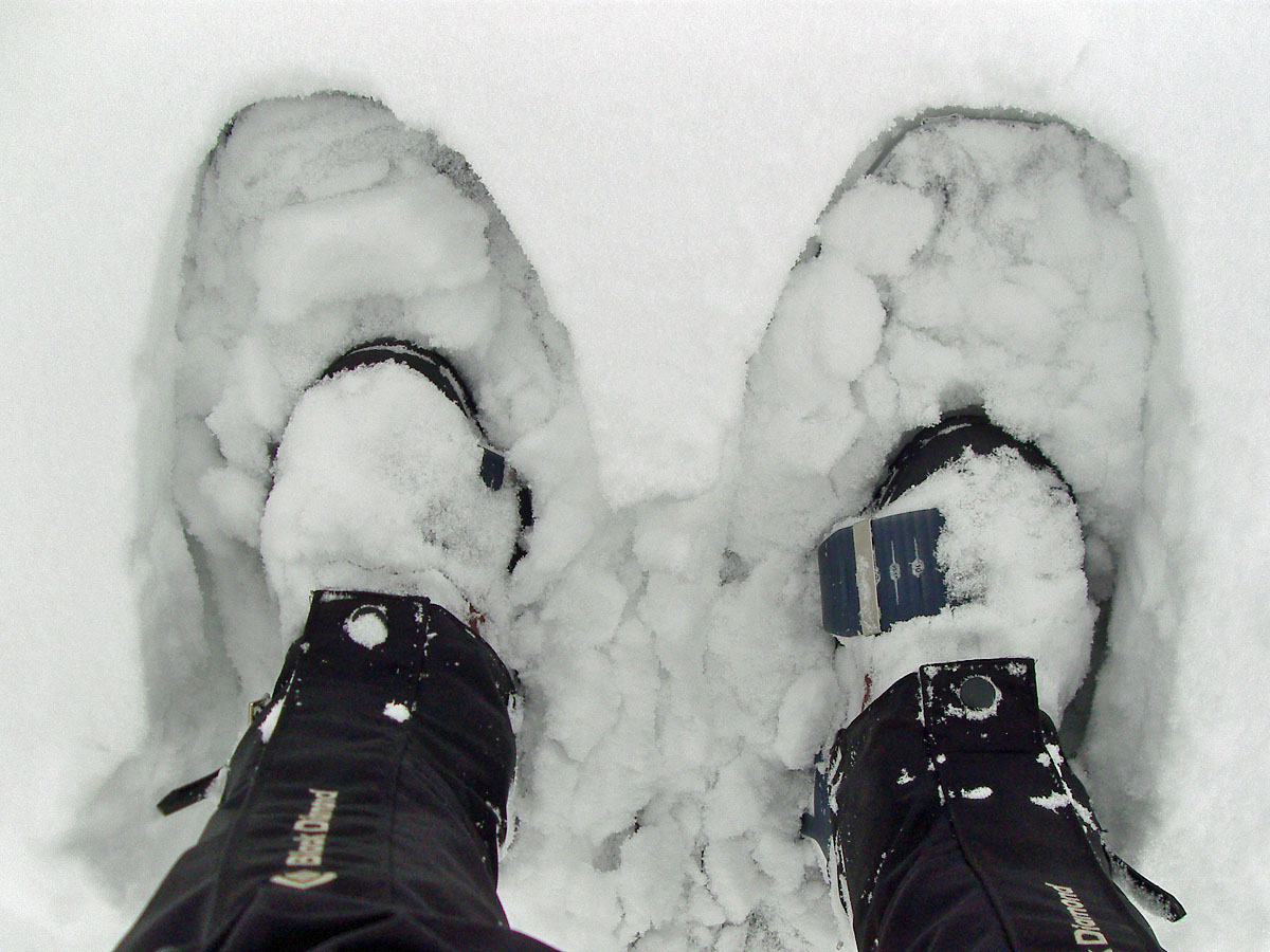 Der Schnee selber war nicht so pappig, nur wenn ich in solche „Slush-Eis-Pfützen“ geraten bin, hat sich der Schnee sowohl an Stiefel als auch den Schneeschuh gepappt und das Mehrgewicht (ein gefühltes Kilo mehr pro Fuß) hab ich dann auch bei jedem Schritt gespürt. Also immer wieder zwischendurch das Zeug von den Schuhen bekommen und weitergestiefelt.