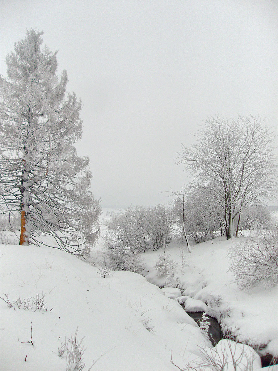 Egal, die Landschaft war so beeindruckend das ich zunächst ein paar Fotos schoss. Ein Baum, der Frost, das Bächlein. Das waren doch mal schöne Motive.