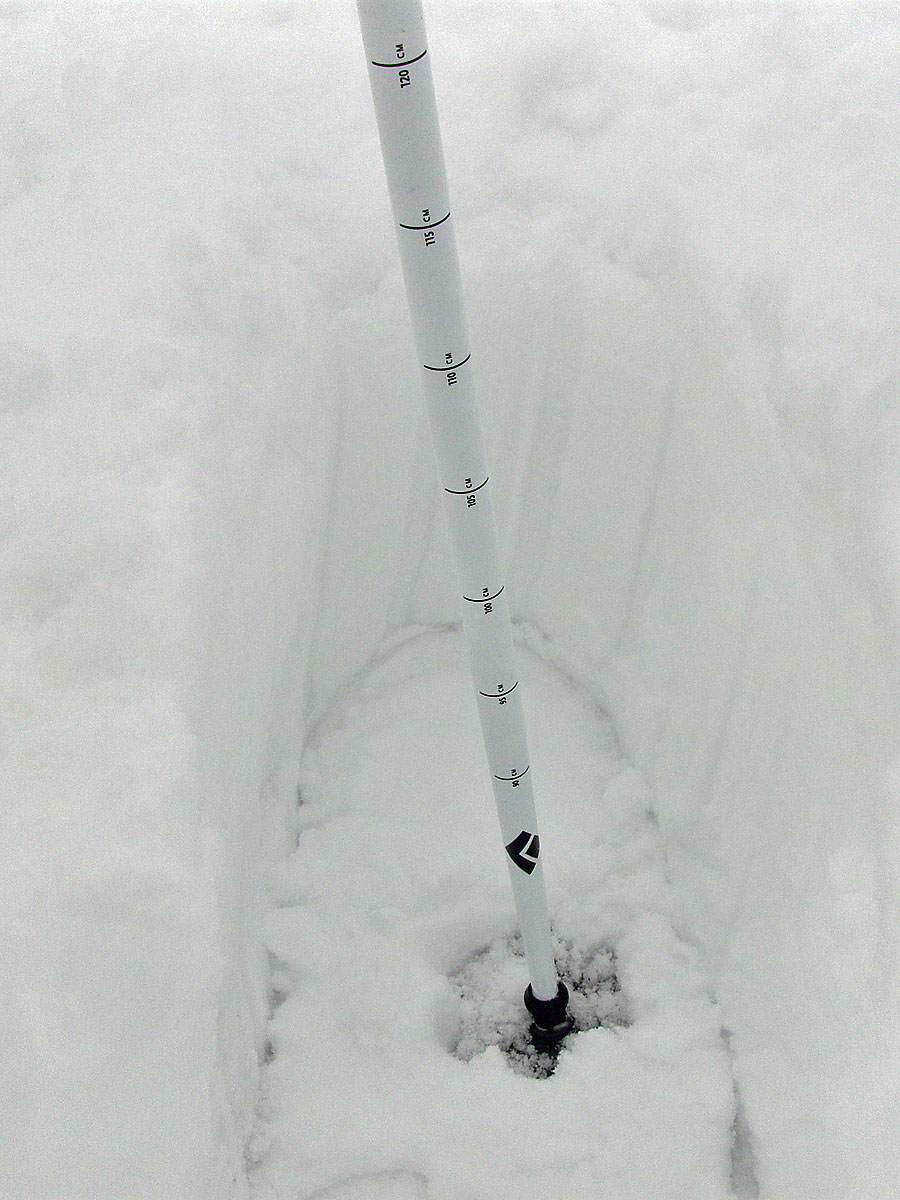 der offenen Fläche stark verweht und einmal brach ich mit dem rechten Fuß tief darin ein. Ach du Schreck. Wer weiß auch, was unter mir war? Ich jedenfalls nicht. Um mal zu prüfen, wie tief das war, hab ich mir den Skistock genommen um mir die Stelle zu merken. Zuhause nachgemessen war ich mit den Schneeschuhen also mehr als 40cm eingesunken. Vermutlich hätte ich ohne die Dinger fast hüfthoch im Schnee gestanden