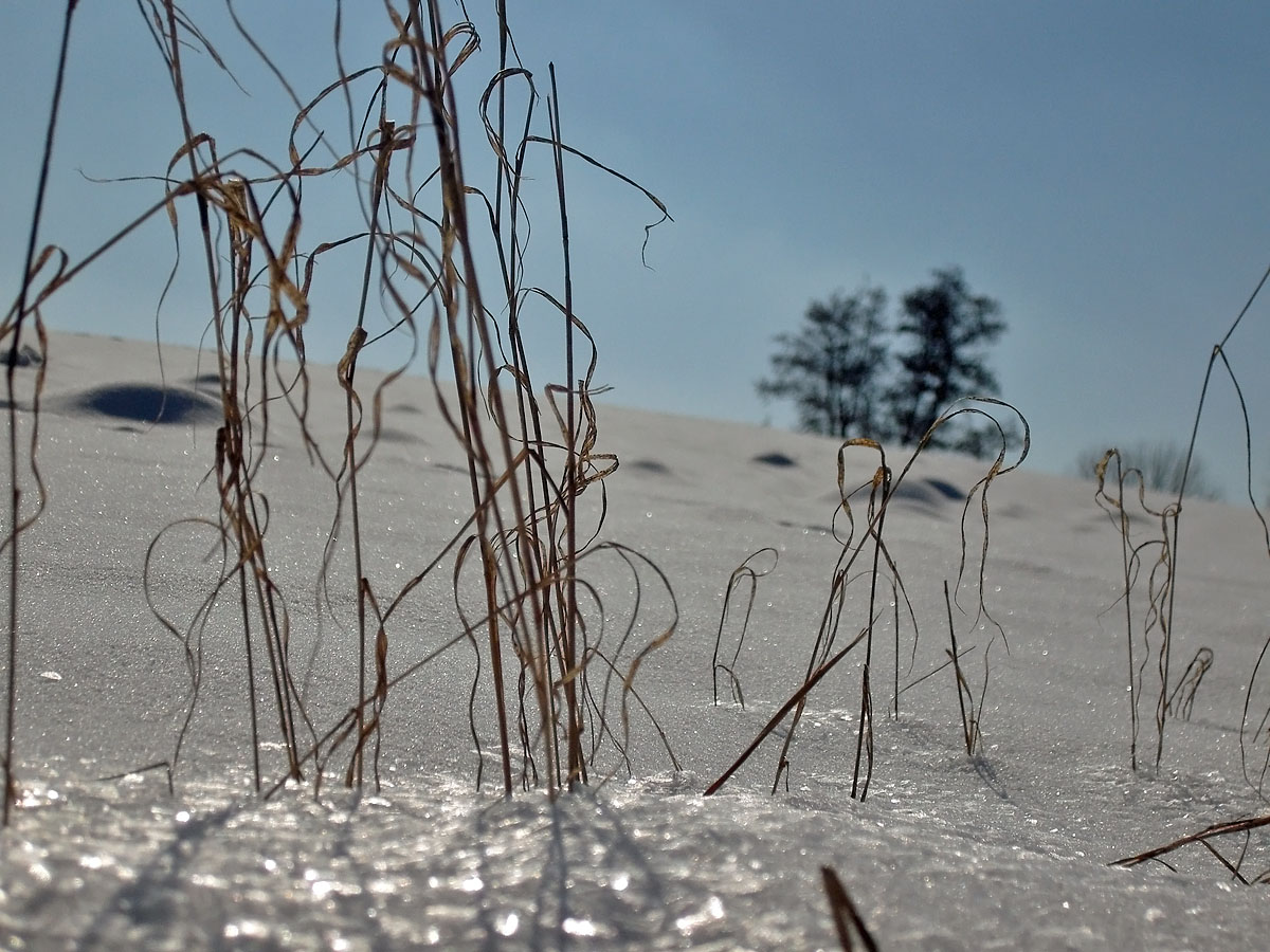 Eisige Formen an Ästen die gelbe Flechten tragen, die Spur eines Tieres das durch den Schnee gewetzt ist, glitzernde Eiskristalle neben abgestorbenen Grashalmen, der Weg, die Sonne, der blaue Himmel.