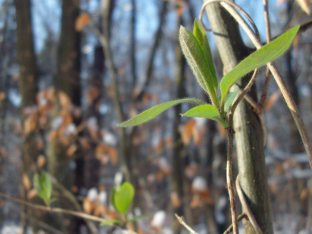 Im Wald entdecke ich grüne Blättchen vongrüne Blätter einer Art Rankpflanze. Keine Ahnung, was das ist, aber scheinbar konnten auch ihr die extremen Minusgrade der letzten Nacht nichts anhaben und so wächst und gedeiht sie scheinbar unbeschadet weiter.