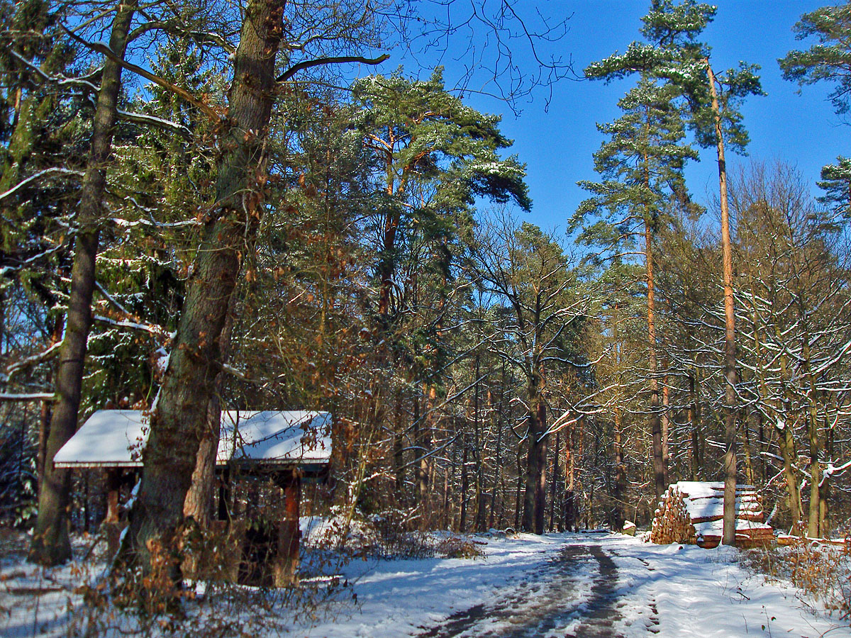 Hütte im WaldSchnell verlasse ich den Rheinhöhenweg aber wieder und folge dem Pfad der hier links ab geht. Im Schnee sind einige Spuren, vermutlich von Joggern, zu erkennen. Ich mag diesen Pfad, denn er führt immer nah am Wald entlang und bietet sogar im Sommer ein wenig „Ausblick“. Es geht mal links, mal rechts bis ich wieder auf den üblichen Rundweg und später eine Hütte treffe.