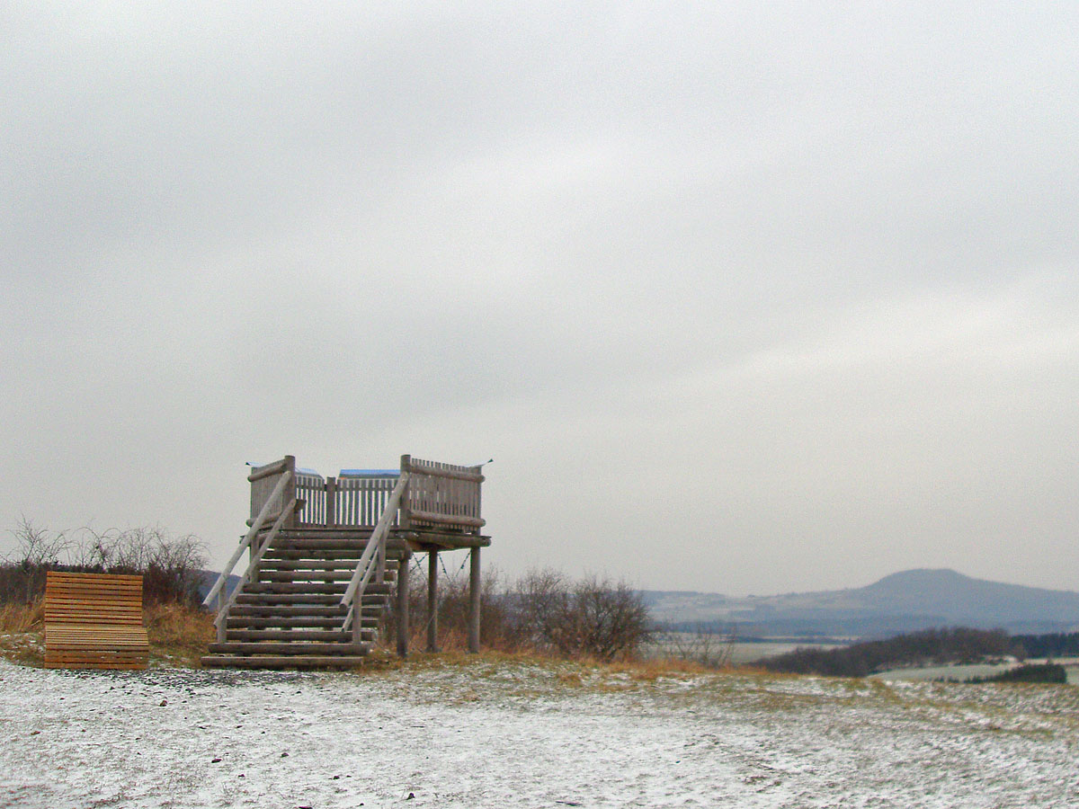 der AussichtspunktKurz vor Pomster liegt der, eine Wanderliegebank daneben und oben auf der Plattform große Tafeln, die mit sommerlichen Bildern (ja, in dem Moment wurde mir sogar ein wenig warm) zeigen, was man wo sieht.
