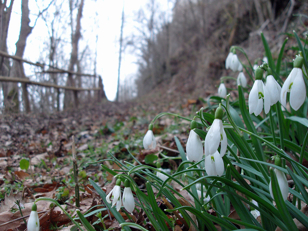 Der schmale Pfad unterhalb der Kirche führt mich hinauf und erst jetzt entdecke ich Schneeglöckchen. Hmm… ist das für Ende Januar nicht ein wenig früh? 😀