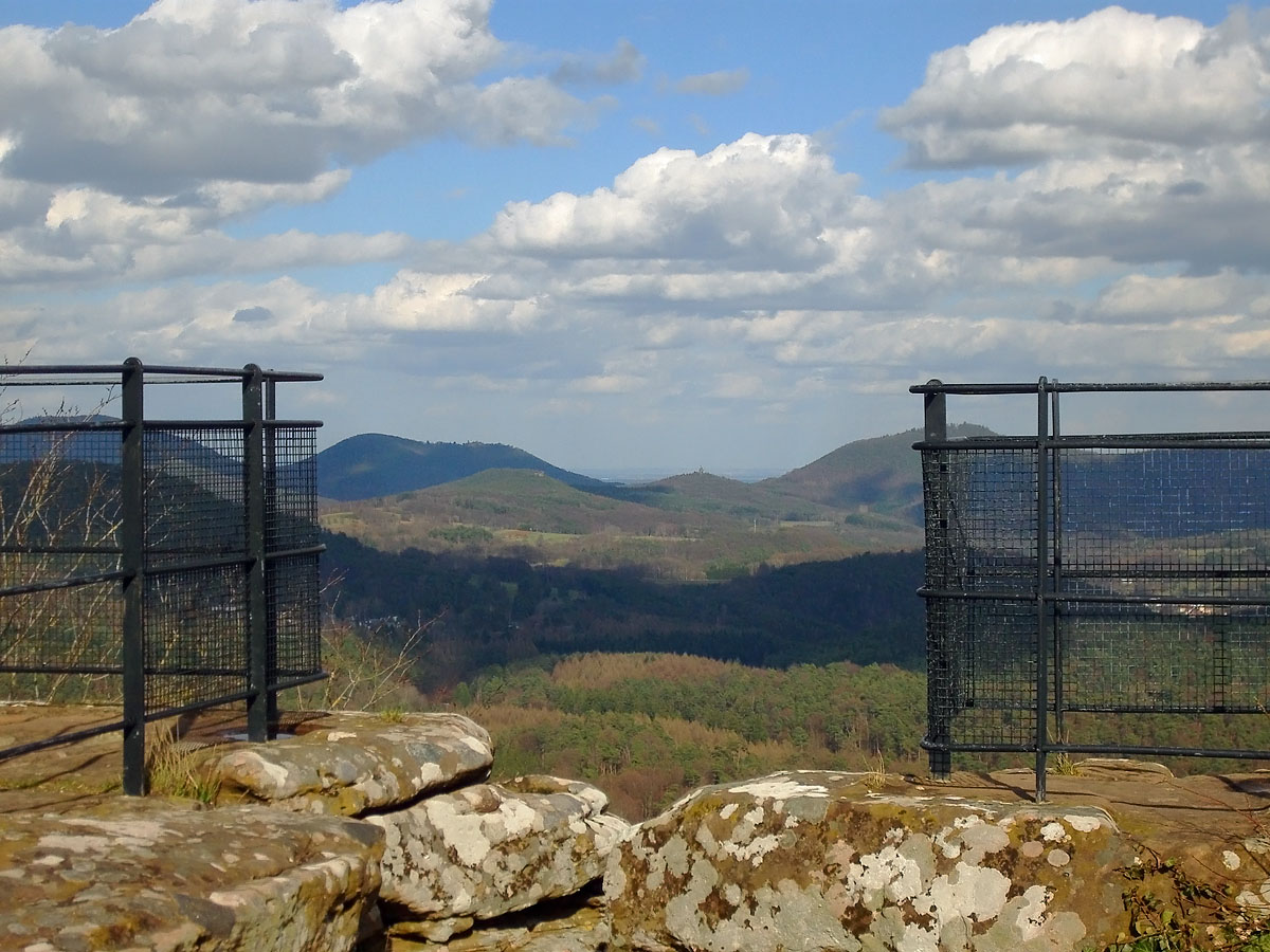 Auf deinem Foto Richtung Osten, Richtung Rheinebene (https://wandernbonn.files.wordpress.com/2013/04/sdc14391.jpg) siehst du halblinks auf dem Bergrücken die Madenburg (http://de.wikipedia.org/wiki/Madenburg – auch ein schönes Wanderziel, z.B. hier: http://www.oepnv-wandern.de/2012/04/19/madenburg-und-asselstein-von-eschbach-nach-annweiler/) und davor die beiden kleineren Berge davor sind bekannt für die Kletterfelsen: links die Lebersteine, rechts der Hundsfels.