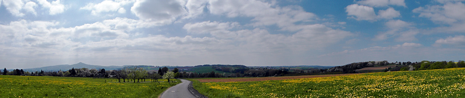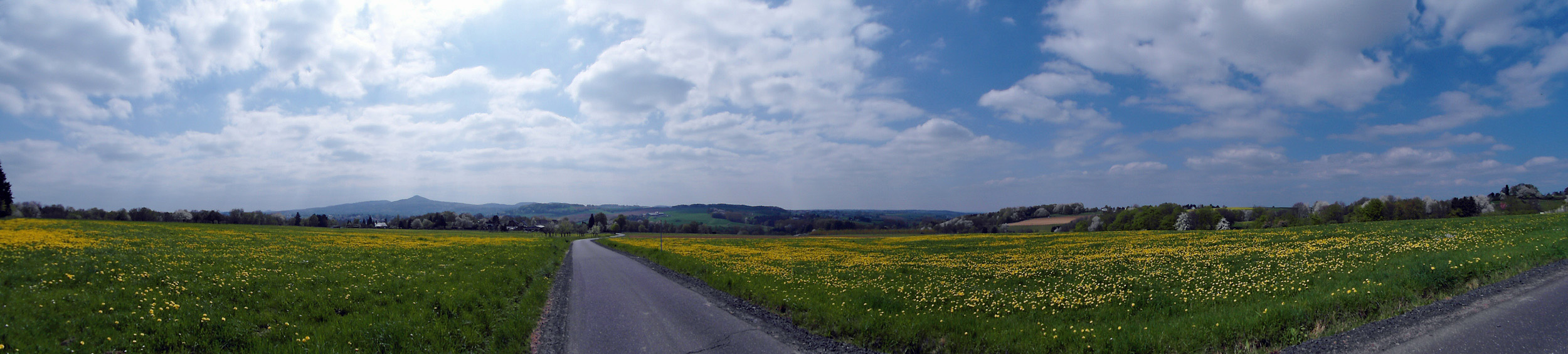 Der Feldweg ist links und rechts von herrlich grünen Wiesen gesäumt, auf denen derzeit Unmengen von gelben Löwenzahnblüten erstrahlen.