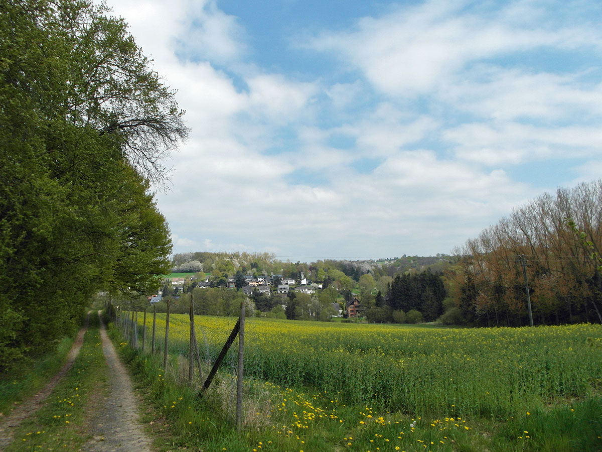 Durch Pleiserhohn, an einer weiteren Kapelle vorbei geht es dann wieder über Feldwege mit Ölbergblick hinab in den Wald.